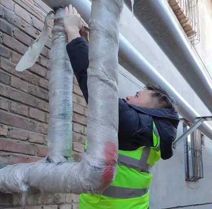 "咱們先把這段管網的巖棉扒了,都戴上手套,別扎著"初二中午12點,筆者在云鼎所車站西街華聯超市倉庫內看到新華西分公司檢修所李明和工作人員正在查找跑水點,他說:"11:30接到電話反映這里二次管網跑水,我就趕緊帶著工作人員過來了,由于這個管網的保溫是巖棉,很扎人,我們處理的時候得小心一些。"沒過一會兒他們就在DN80二次管網上找到了跑水點,為了不影響正常供熱,李明決定帶水帶壓用打卡子的方式封堵漏點,經過半個多小時的作業,搶修完成。李明告訴筆者:"春節對于我們來說和平時一樣,我來富泰熱力工作了20年了,年年如此,也希望和家里人一起過個春節,可是我們要是休息了,用戶家里用熱方面有什么事兒怎么辦,工作性質就是這樣,既然選擇了這份工作,我就得把它做好。"