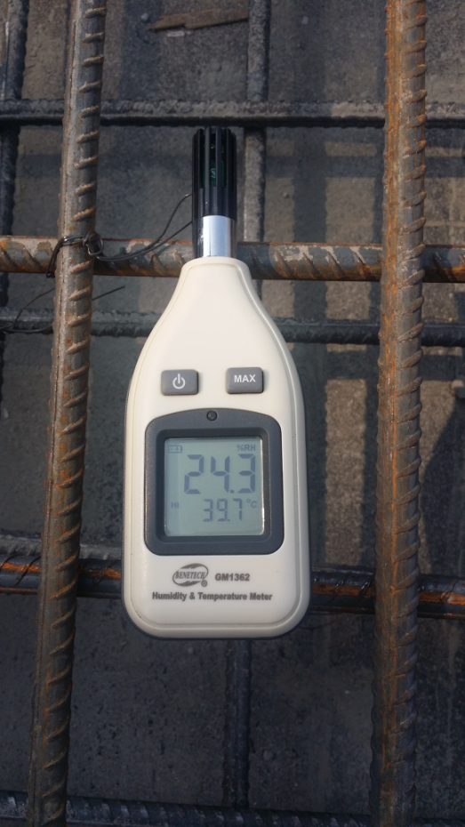 2017年7月18日上午10:30左右,呼和浩特市低碳供熱亞行貸款項目辛家營熱源廠中繼泵房蓄水池墻體和消防泵房梁柱開始澆筑,此時施工現場溫度為39.7℃。