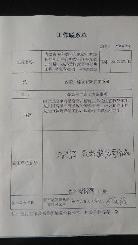 為此,工程自3月31日開工以來,全體參加建設的單位和個人,克服種種困難,加班加點,在保證安全和質量的前提下,為確保今冬按時投運而努力施工;尤其是近日持續高溫以來,為既能確保施工人員的安全,又能確保工期不后延,施工方采取了早上工,晚收工,增加休息時間,給施工人員熬制防暑綠豆湯等辦法,從而保證了施工有效時間,確保工期沒有任何延誤。同時,我分公司為保證暑期施工人員安全,及時給施工單位下發了《工作聯系單》,對高溫天氣施工提出要求,并要求施工單位有具體防暑措施。